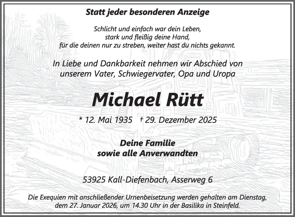 Hier finden Sie alle Traueranzeigen aus der Zeitung, die bisher für Michael Rütt erschienen sind. Weitere Traueranzeigen, die in der Zeitung erscheinen, werden hier ebenfalls aufgelistet