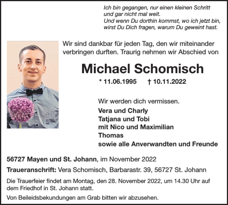 Hier finden Sie alle Traueranzeigen aus der Zeitung, die bisher für Michael Schomisch erschienen sind. Weitere Traueranzeigen, die in der Zeitung erscheinen, werden hier ebenfalls aufgelistet