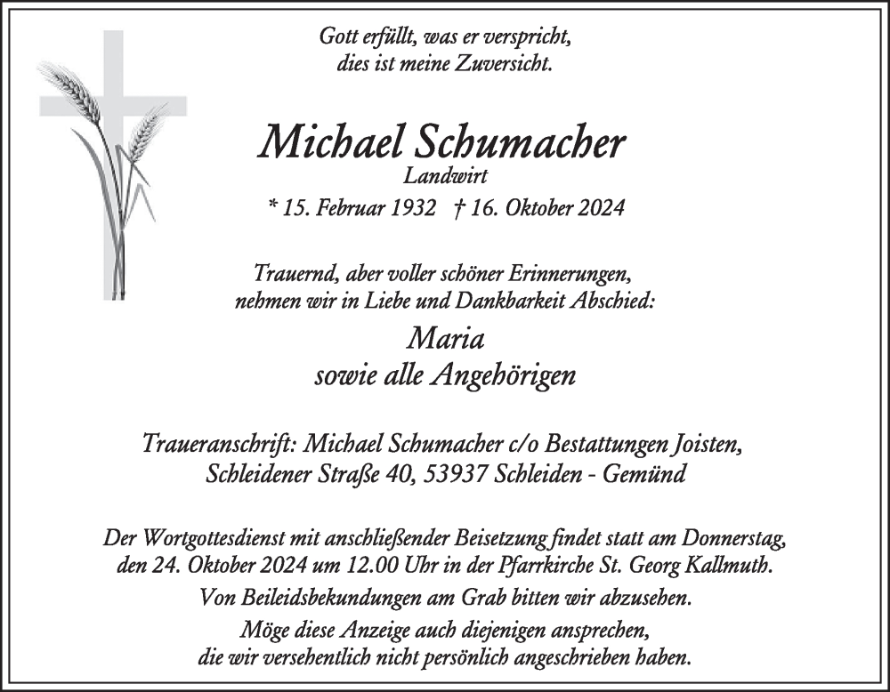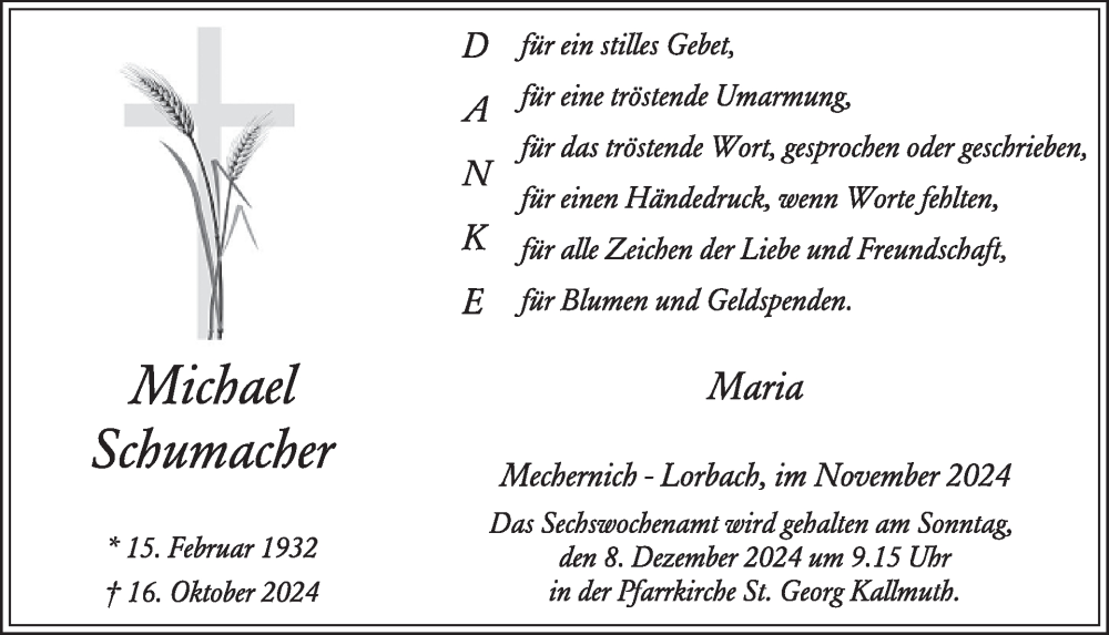 Hier finden Sie alle Traueranzeigen aus der Zeitung, die bisher für Michael Schumacher erschienen sind. Weitere Traueranzeigen, die in der Zeitung erscheinen, werden hier ebenfalls aufgelistet