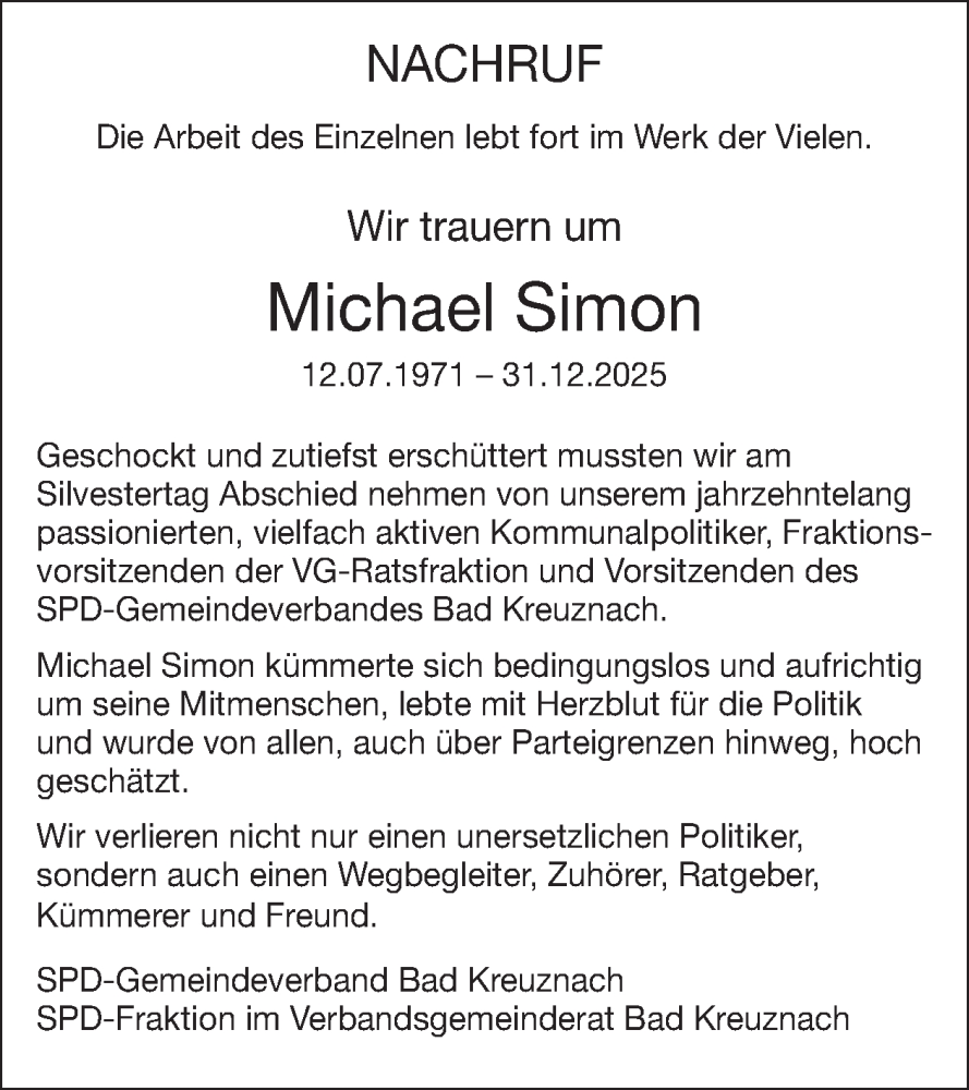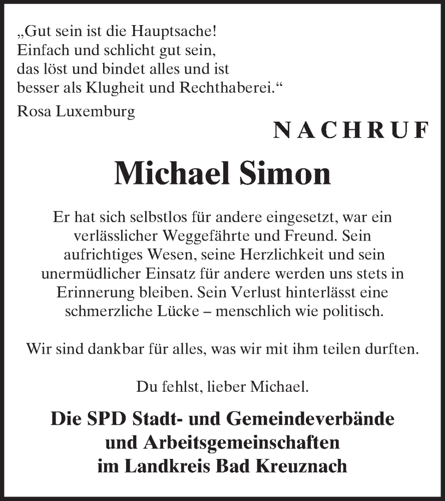 Hier finden Sie alle Traueranzeigen aus der Zeitung, die bisher für Michael Simon erschienen sind. Weitere Traueranzeigen, die in der Zeitung erscheinen, werden hier ebenfalls aufgelistet