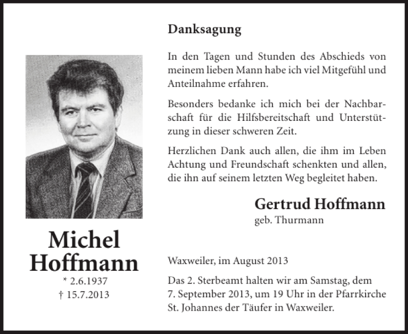 Hier finden Sie alle Traueranzeigen aus der Zeitung, die bisher für Michel Hoffmann erschienen sind. Weitere Traueranzeigen, die in der Zeitung erscheinen, werden hier ebenfalls aufgelistet