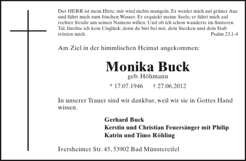 Hier finden Sie alle Traueranzeigen aus der Zeitung, die bisher für Monika Buck erschienen sind. Weitere Traueranzeigen, die in der Zeitung erscheinen, werden hier ebenfalls aufgelistet