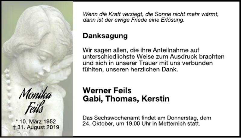 Hier finden Sie alle Traueranzeigen aus der Zeitung, die bisher für Monika Feils erschienen sind. Weitere Traueranzeigen, die in der Zeitung erscheinen, werden hier ebenfalls aufgelistet