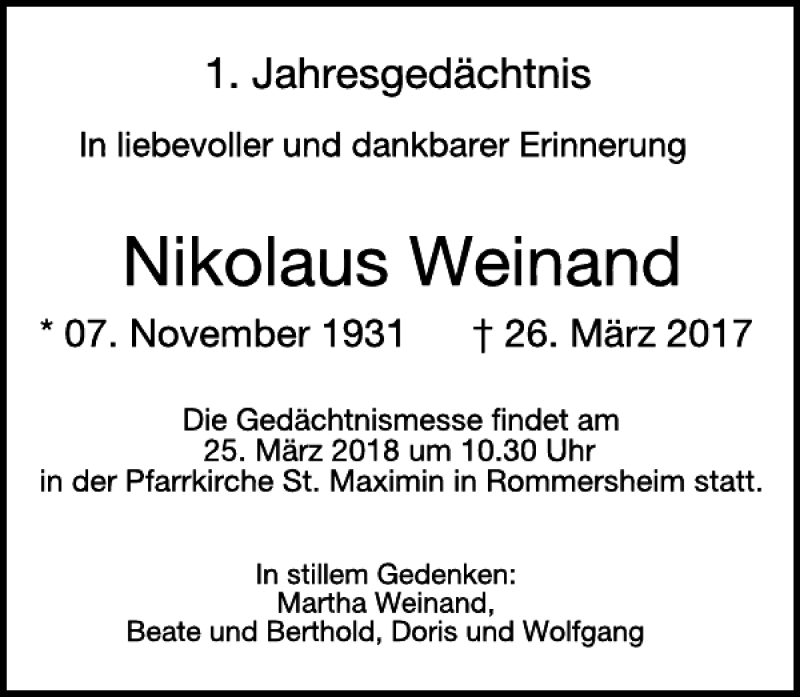 Hier finden Sie alle Traueranzeigen aus der Zeitung, die bisher für Nikolaus Weinand erschienen sind. Weitere Traueranzeigen, die in der Zeitung erscheinen, werden hier ebenfalls aufgelistet