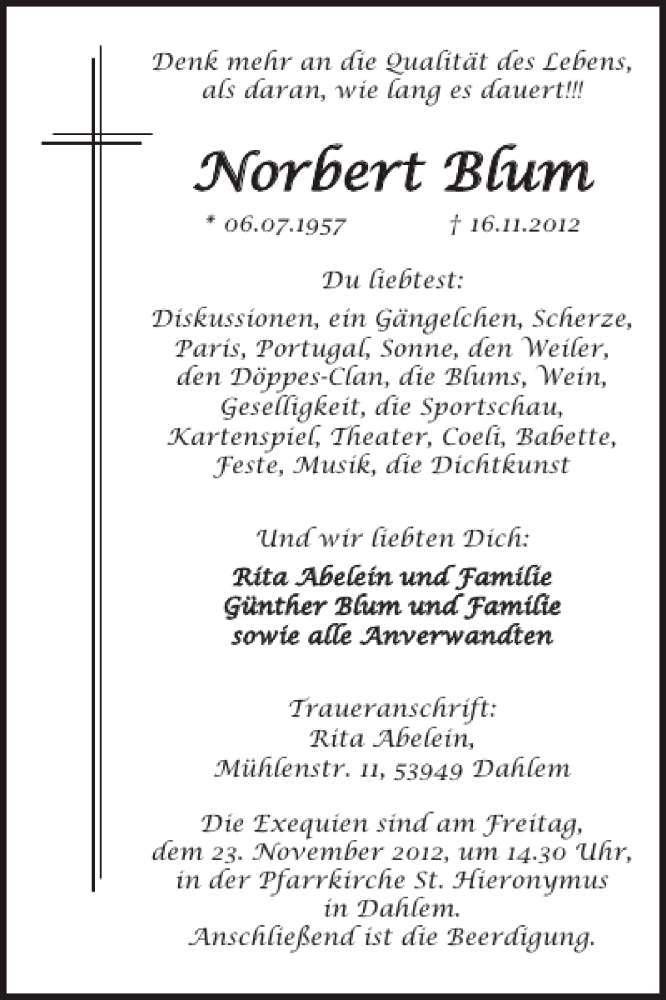 Hier finden Sie alle Traueranzeigen aus der Zeitung, die bisher für Norbert Blum erschienen sind. Weitere Traueranzeigen, die in der Zeitung erscheinen, werden hier ebenfalls aufgelistet