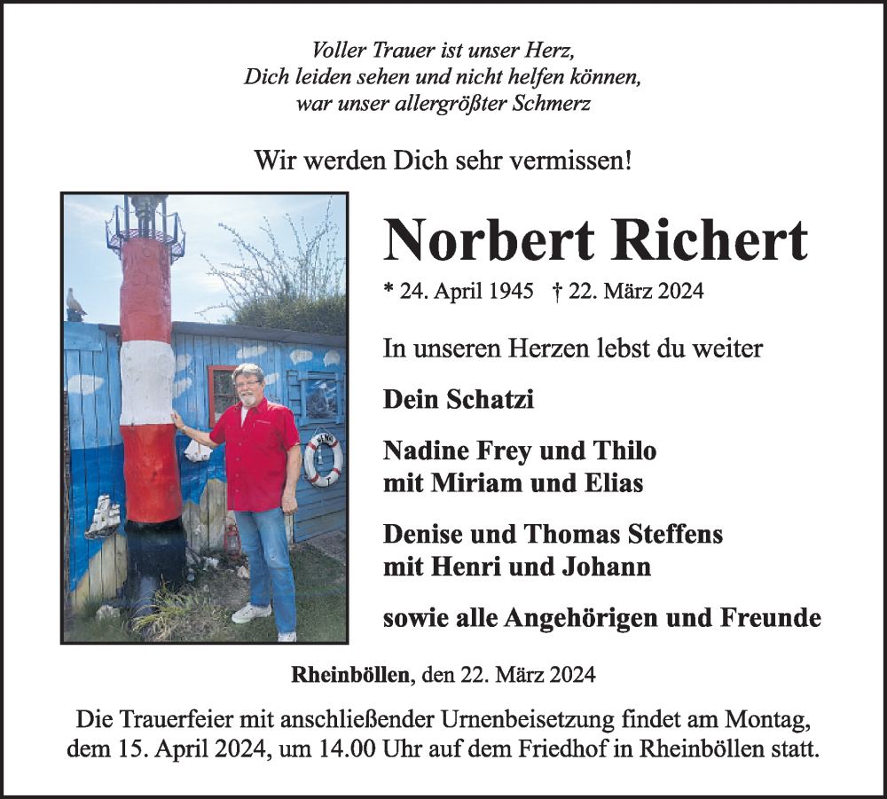 Hier finden Sie alle Traueranzeigen aus der Zeitung, die bisher für Norbert Kichert erschienen sind. Weitere Traueranzeigen, die in der Zeitung erscheinen, werden hier ebenfalls aufgelistet