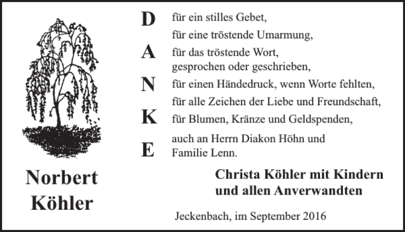 Hier finden Sie alle Traueranzeigen aus der Zeitung, die bisher für Norbert Köhler erschienen sind. Weitere Traueranzeigen, die in der Zeitung erscheinen, werden hier ebenfalls aufgelistet