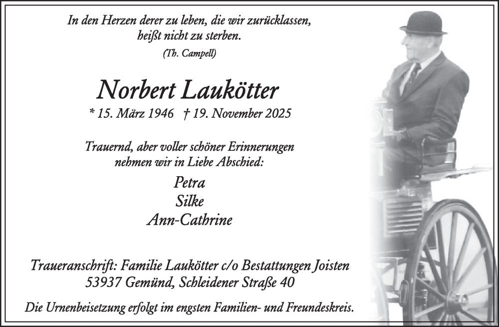 Hier finden Sie alle Traueranzeigen aus der Zeitung, die bisher für Norbert Laukötter erschienen sind. Weitere Traueranzeigen, die in der Zeitung erscheinen, werden hier ebenfalls aufgelistet