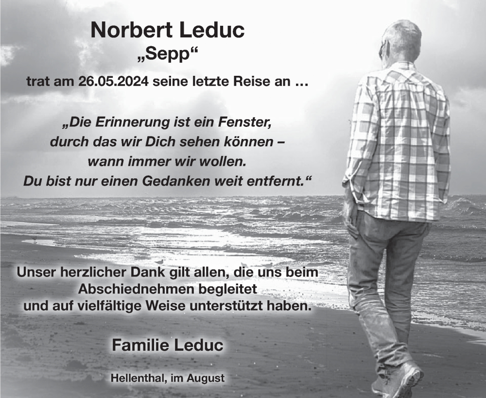 Hier finden Sie alle Traueranzeigen aus der Zeitung, die bisher für Norbert Leduc erschienen sind. Weitere Traueranzeigen, die in der Zeitung erscheinen, werden hier ebenfalls aufgelistet