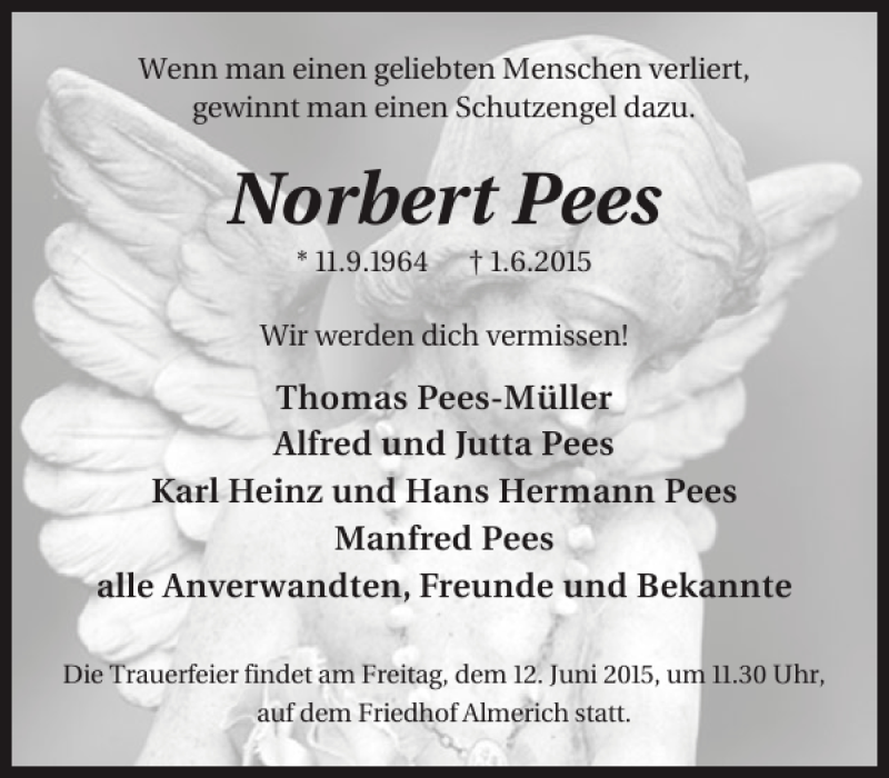 Hier finden Sie alle Traueranzeigen aus der Zeitung, die bisher für Norbert Pees erschienen sind. Weitere Traueranzeigen, die in der Zeitung erscheinen, werden hier ebenfalls aufgelistet