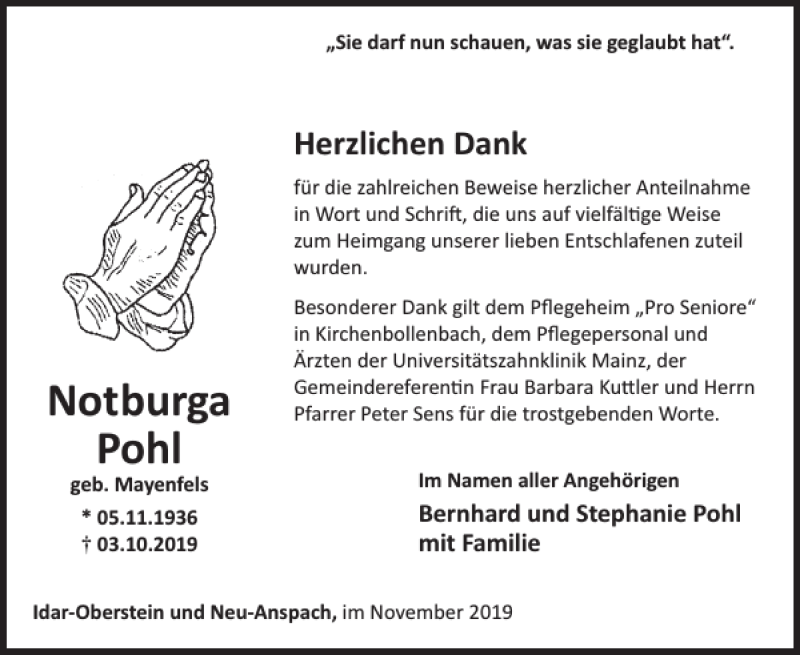 Hier finden Sie alle Traueranzeigen aus der Zeitung, die bisher für Notburga Pohl erschienen sind. Weitere Traueranzeigen, die in der Zeitung erscheinen, werden hier ebenfalls aufgelistet
