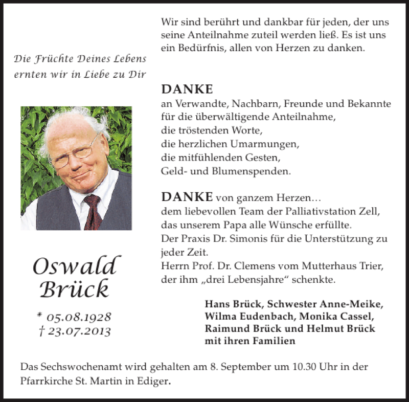 Hier finden Sie alle Traueranzeigen aus der Zeitung, die bisher für Oswald Brück erschienen sind. Weitere Traueranzeigen, die in der Zeitung erscheinen, werden hier ebenfalls aufgelistet