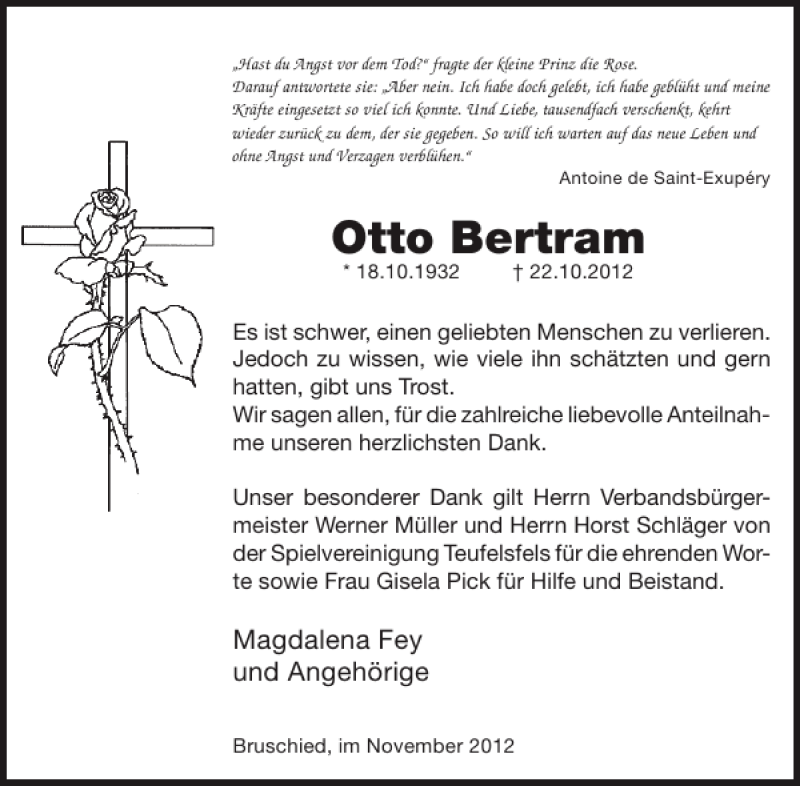 Hier finden Sie alle Traueranzeigen aus der Zeitung, die bisher für Otto Bertram erschienen sind. Weitere Traueranzeigen, die in der Zeitung erscheinen, werden hier ebenfalls aufgelistet