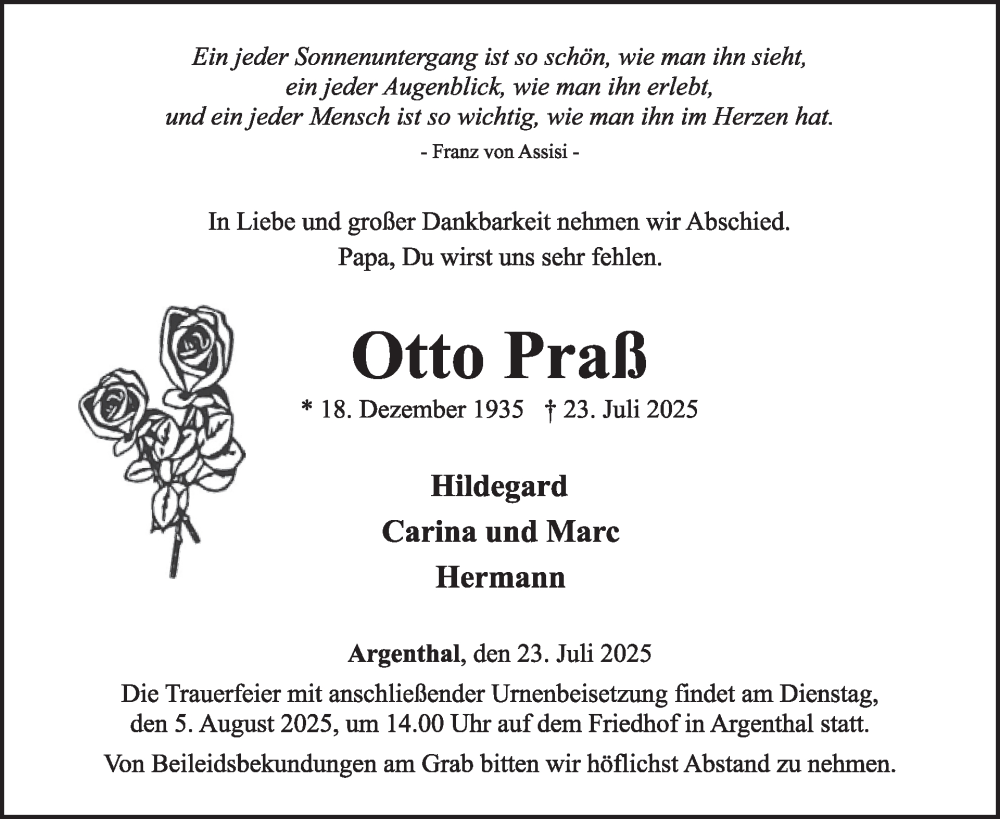 Hier finden Sie alle Traueranzeigen aus der Zeitung, die bisher für Otto Pral erschienen sind. Weitere Traueranzeigen, die in der Zeitung erscheinen, werden hier ebenfalls aufgelistet