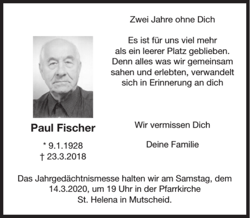 Hier finden Sie alle Traueranzeigen aus der Zeitung, die bisher für Paul Fischer erschienen sind. Weitere Traueranzeigen, die in der Zeitung erscheinen, werden hier ebenfalls aufgelistet
