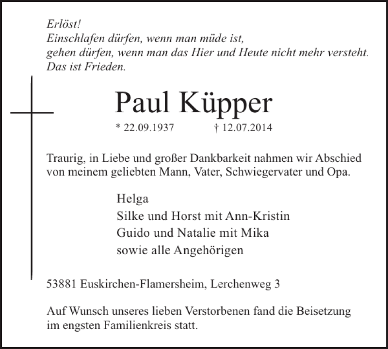 Hier finden Sie alle Traueranzeigen aus der Zeitung, die bisher für Paul Küpper erschienen sind. Weitere Traueranzeigen, die in der Zeitung erscheinen, werden hier ebenfalls aufgelistet