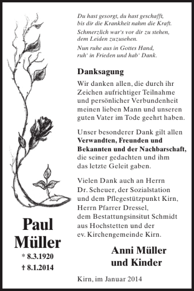Hier finden Sie alle Traueranzeigen aus der Zeitung, die bisher für Paul Müller erschienen sind. Weitere Traueranzeigen, die in der Zeitung erscheinen, werden hier ebenfalls aufgelistet