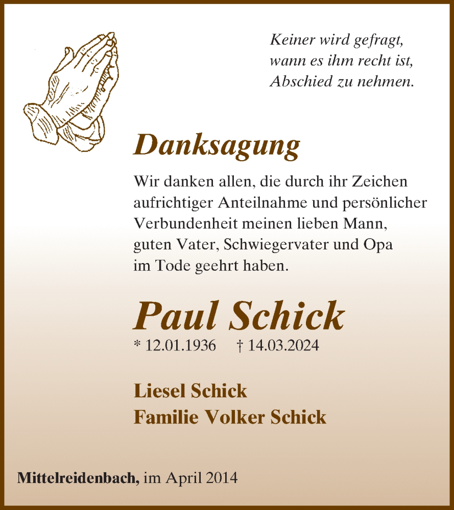 Hier finden Sie alle Traueranzeigen aus der Zeitung, die bisher für Paul Schick erschienen sind. Weitere Traueranzeigen, die in der Zeitung erscheinen, werden hier ebenfalls aufgelistet