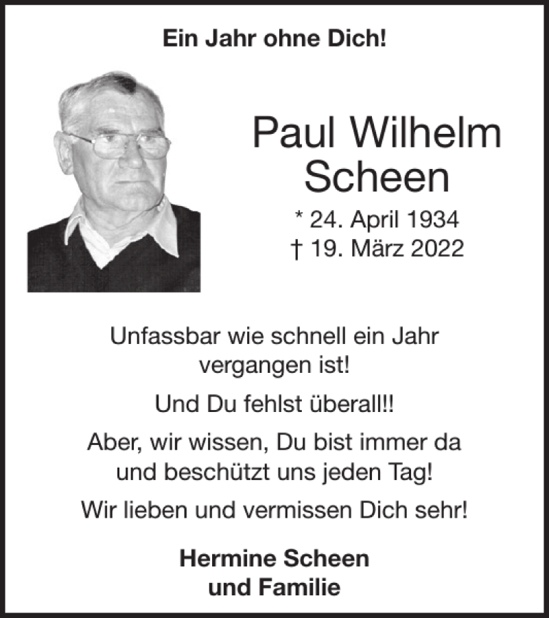 Hier finden Sie alle Traueranzeigen aus der Zeitung, die bisher für Paul Wilhelm Scheen erschienen sind. Weitere Traueranzeigen, die in der Zeitung erscheinen, werden hier ebenfalls aufgelistet