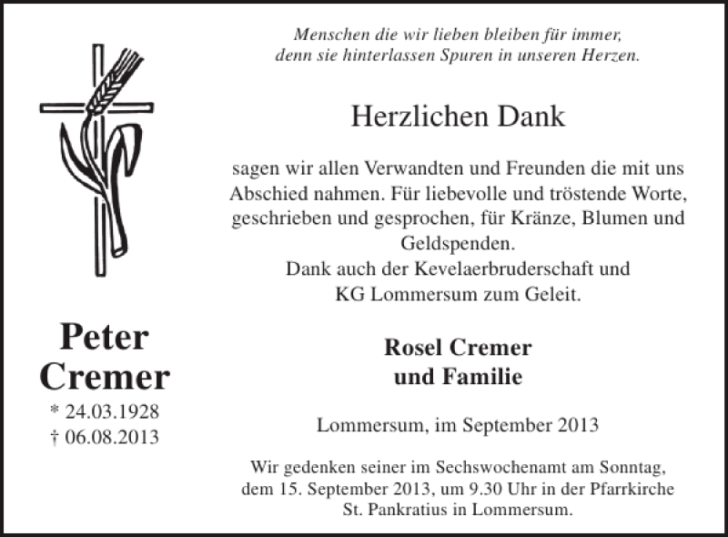 Hier finden Sie alle Traueranzeigen aus der Zeitung, die bisher für Peter Cremer erschienen sind. Weitere Traueranzeigen, die in der Zeitung erscheinen, werden hier ebenfalls aufgelistet