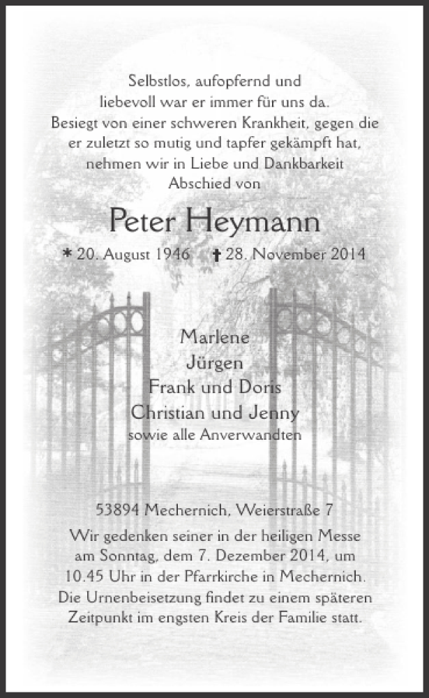 Hier finden Sie alle Traueranzeigen aus der Zeitung, die bisher für Peter Heymann erschienen sind. Weitere Traueranzeigen, die in der Zeitung erscheinen, werden hier ebenfalls aufgelistet