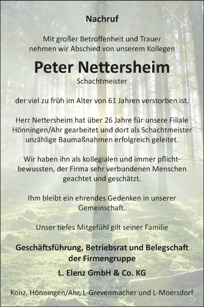 Hier finden Sie alle Traueranzeigen aus der Zeitung, die bisher für Peter Nettersheim erschienen sind. Weitere Traueranzeigen, die in der Zeitung erscheinen, werden hier ebenfalls aufgelistet