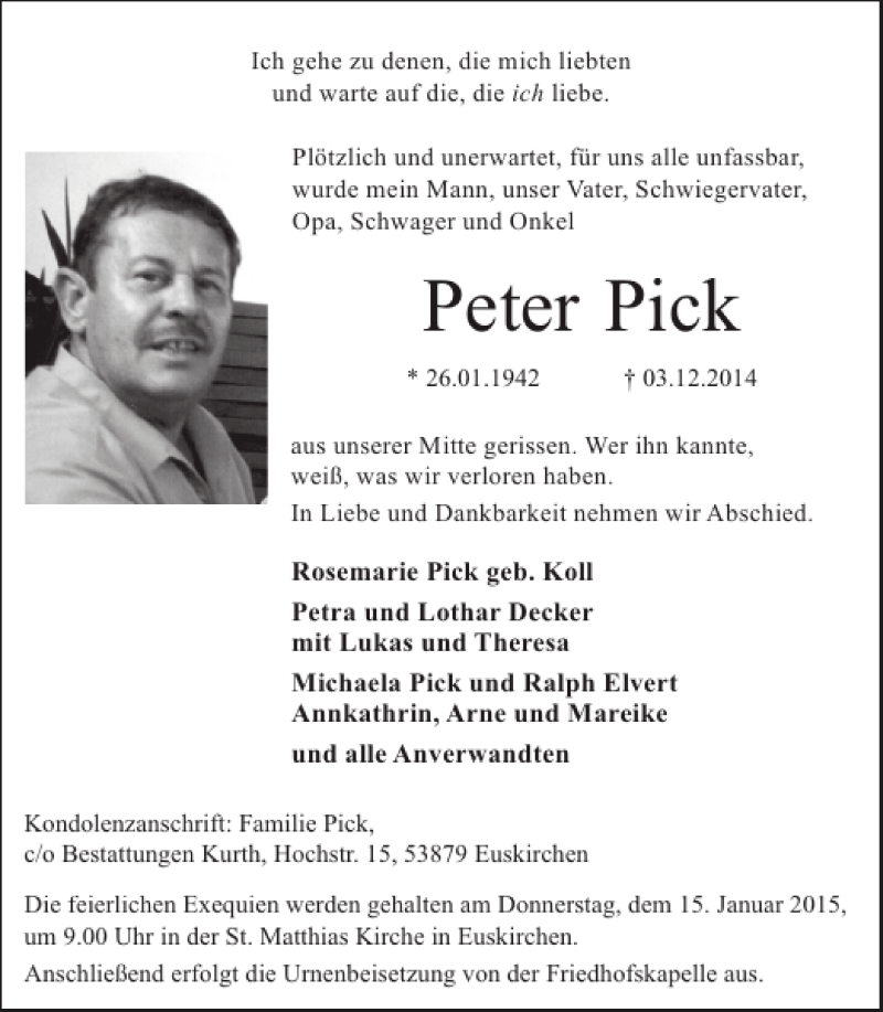 Hier finden Sie alle Traueranzeigen aus der Zeitung, die bisher für Peter Pick erschienen sind. Weitere Traueranzeigen, die in der Zeitung erscheinen, werden hier ebenfalls aufgelistet