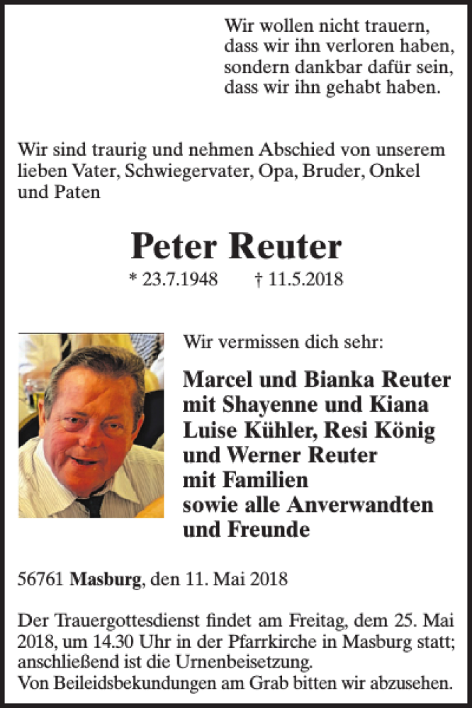 Hier finden Sie alle Traueranzeigen aus der Zeitung, die bisher für Peter Reuter erschienen sind. Weitere Traueranzeigen, die in der Zeitung erscheinen, werden hier ebenfalls aufgelistet
