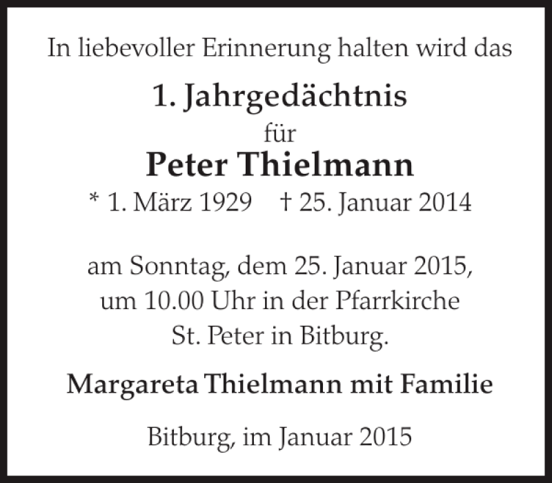 Hier finden Sie alle Traueranzeigen aus der Zeitung, die bisher für Peter Thielmann erschienen sind. Weitere Traueranzeigen, die in der Zeitung erscheinen, werden hier ebenfalls aufgelistet
