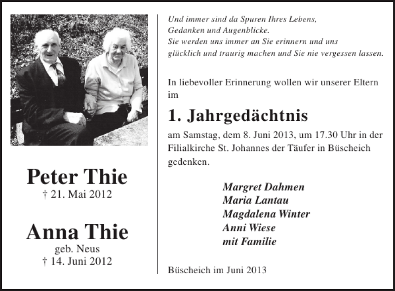 Hier finden Sie alle Traueranzeigen aus der Zeitung, die bisher für Peter Thie Anna Thie erschienen sind. Weitere Traueranzeigen, die in der Zeitung erscheinen, werden hier ebenfalls aufgelistet