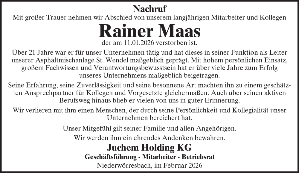 Hier finden Sie alle Traueranzeigen aus der Zeitung, die bisher für Rainer Maas erschienen sind. Weitere Traueranzeigen, die in der Zeitung erscheinen, werden hier ebenfalls aufgelistet