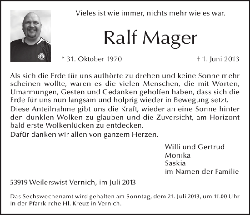 Hier finden Sie alle Traueranzeigen aus der Zeitung, die bisher für Ralf Mager erschienen sind. Weitere Traueranzeigen, die in der Zeitung erscheinen, werden hier ebenfalls aufgelistet