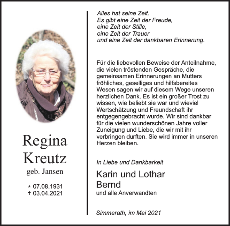 Hier finden Sie alle Traueranzeigen aus der Zeitung, die bisher für Regina Kreutz erschienen sind. Weitere Traueranzeigen, die in der Zeitung erscheinen, werden hier ebenfalls aufgelistet