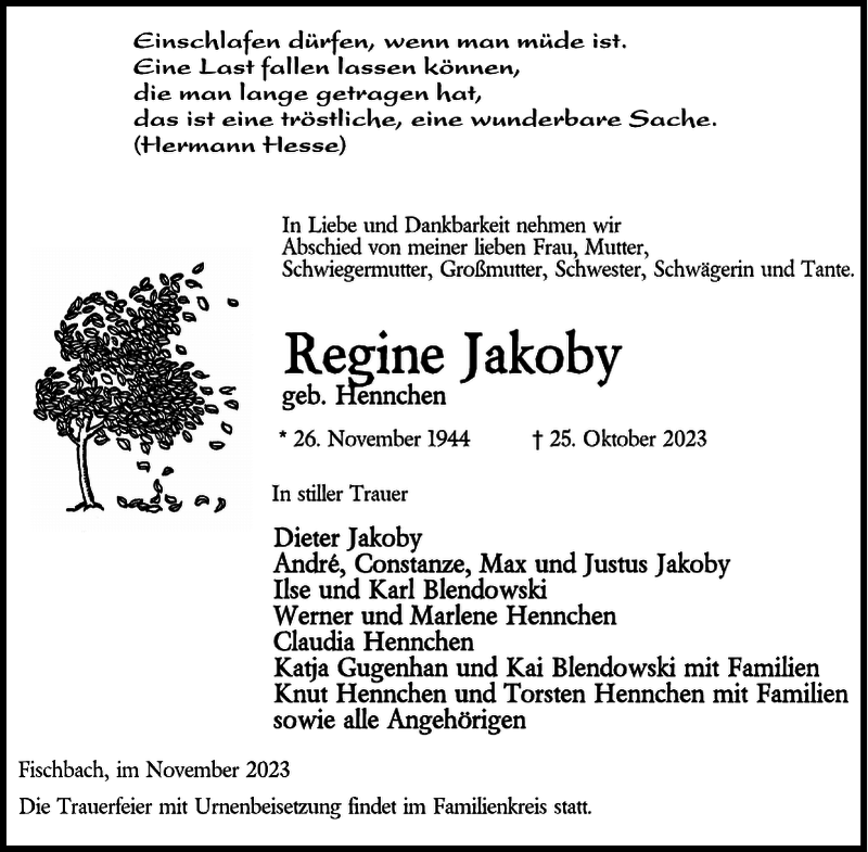 Hier finden Sie alle Traueranzeigen aus der Zeitung, die bisher für Regine Jakoby erschienen sind. Weitere Traueranzeigen, die in der Zeitung erscheinen, werden hier ebenfalls aufgelistet