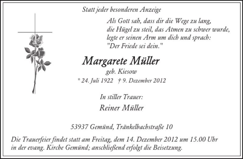 Hier finden Sie alle Traueranzeigen aus der Zeitung, die bisher für Reiner Müller erschienen sind. Weitere Traueranzeigen, die in der Zeitung erscheinen, werden hier ebenfalls aufgelistet