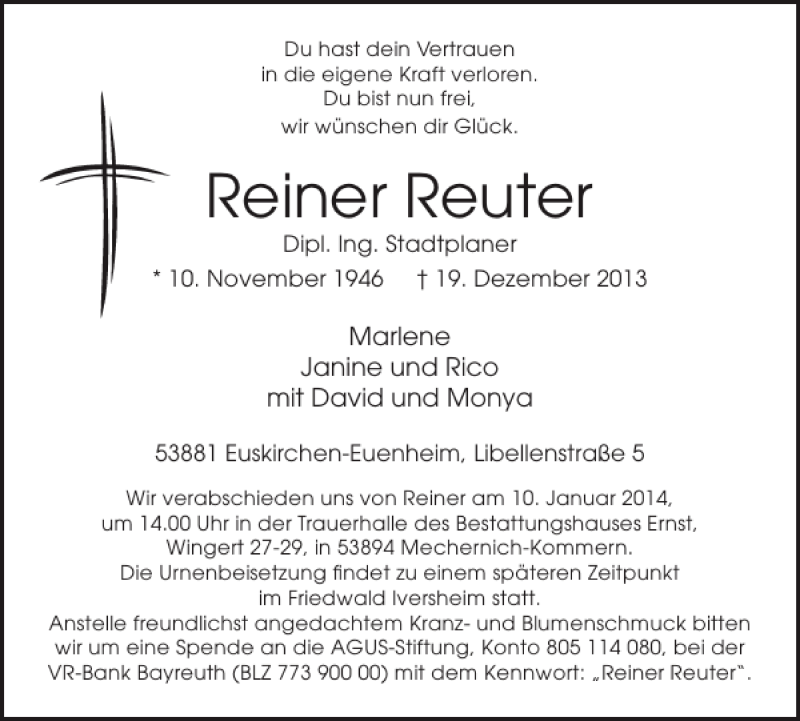 Hier finden Sie alle Traueranzeigen aus der Zeitung, die bisher für Reiner Reuter erschienen sind. Weitere Traueranzeigen, die in der Zeitung erscheinen, werden hier ebenfalls aufgelistet