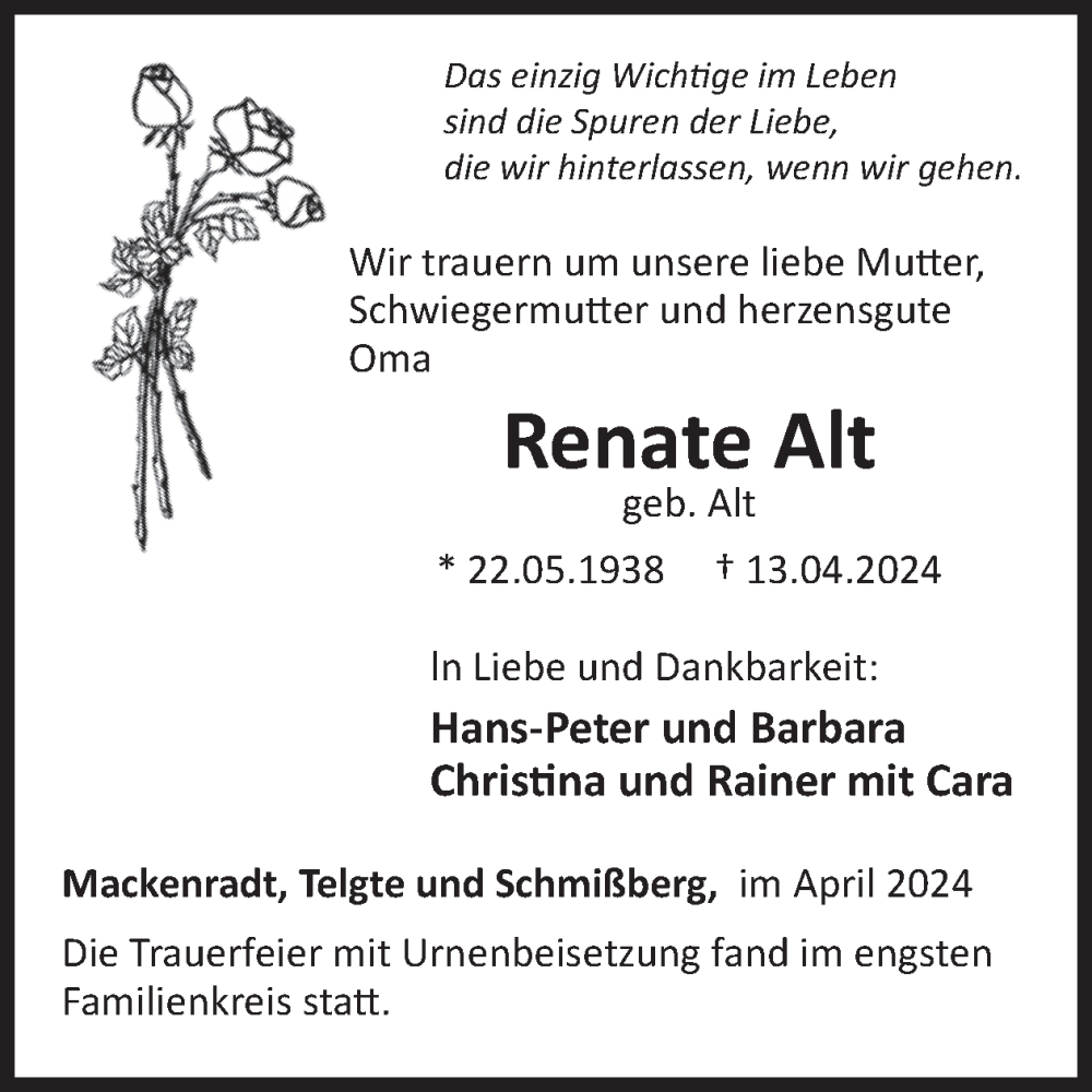 Hier finden Sie alle Traueranzeigen aus der Zeitung, die bisher für Renate Alt erschienen sind. Weitere Traueranzeigen, die in der Zeitung erscheinen, werden hier ebenfalls aufgelistet