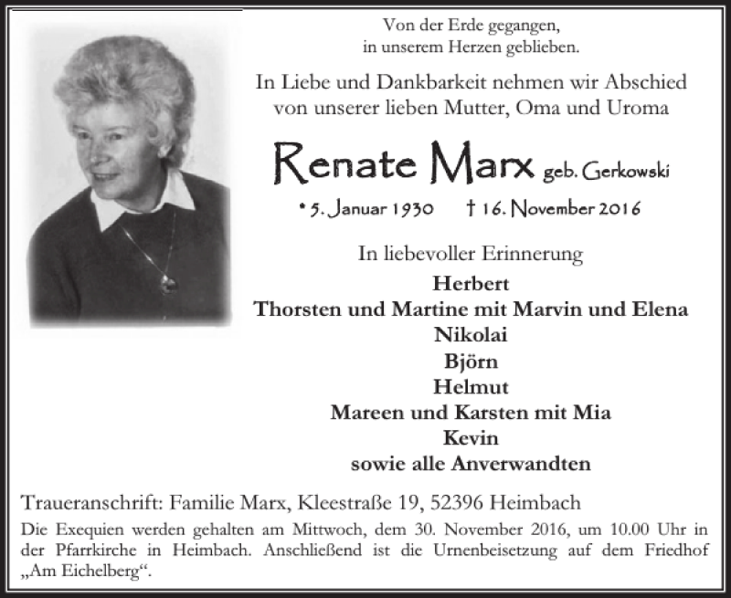 Hier finden Sie alle Traueranzeigen aus der Zeitung, die bisher für Renate Marx erschienen sind. Weitere Traueranzeigen, die in der Zeitung erscheinen, werden hier ebenfalls aufgelistet