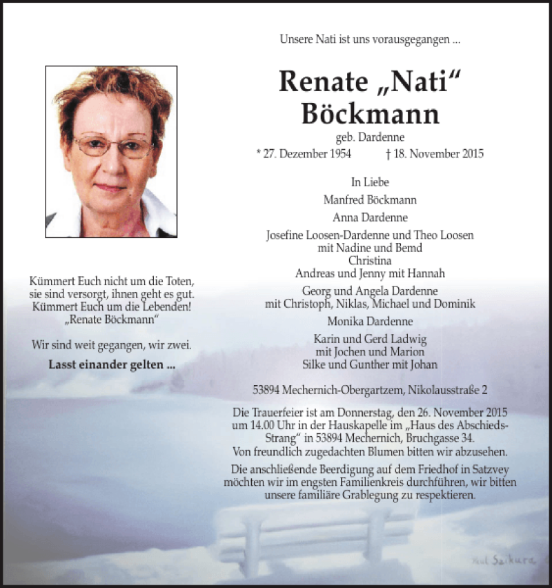 Hier finden Sie alle Traueranzeigen aus der Zeitung, die bisher für Renate Nati Böckmann erschienen sind. Weitere Traueranzeigen, die in der Zeitung erscheinen, werden hier ebenfalls aufgelistet