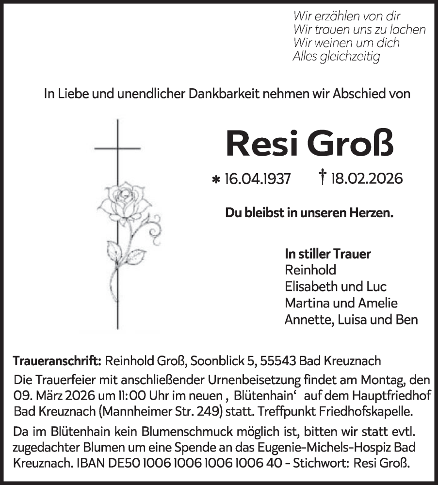 Hier finden Sie alle Traueranzeigen aus der Zeitung, die bisher für Resi Groß erschienen sind. Weitere Traueranzeigen, die in der Zeitung erscheinen, werden hier ebenfalls aufgelistet