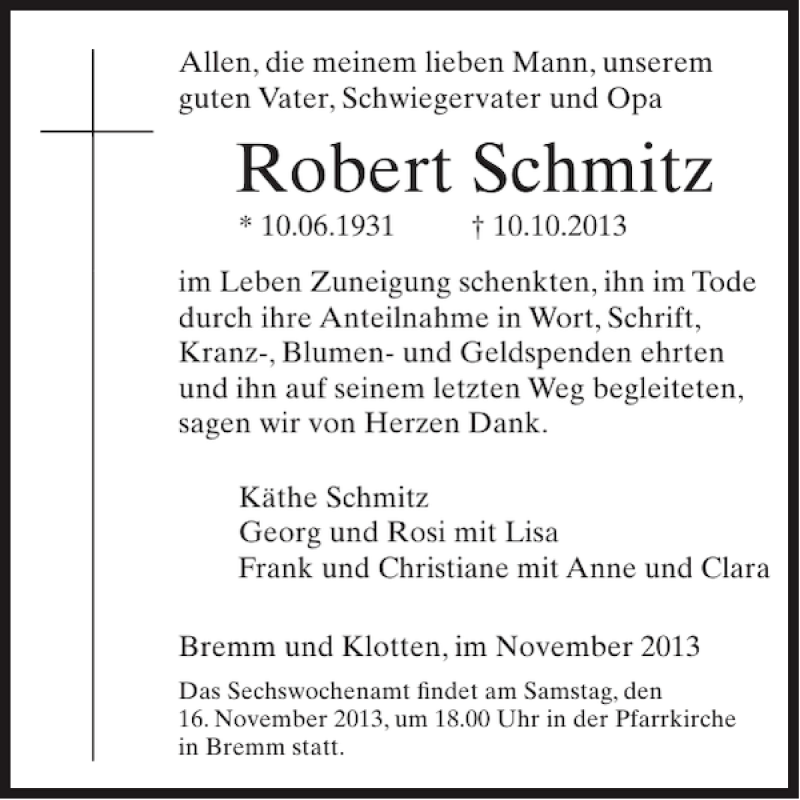 Hier finden Sie alle Traueranzeigen aus der Zeitung, die bisher für Robert Schmitz erschienen sind. Weitere Traueranzeigen, die in der Zeitung erscheinen, werden hier ebenfalls aufgelistet