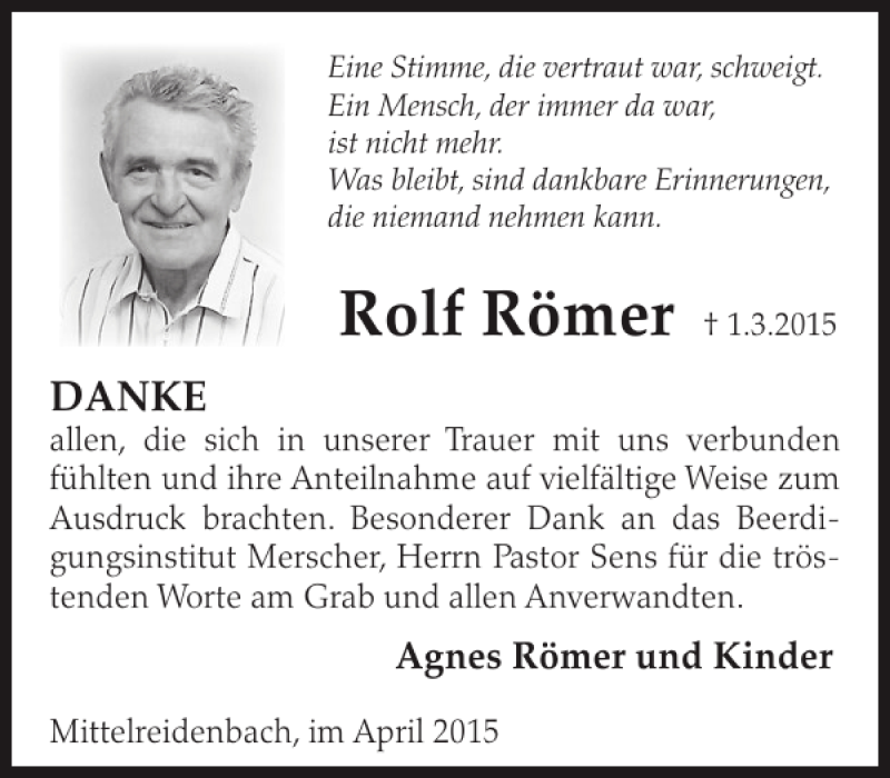 Hier finden Sie alle Traueranzeigen aus der Zeitung, die bisher für Rolf Römer erschienen sind. Weitere Traueranzeigen, die in der Zeitung erscheinen, werden hier ebenfalls aufgelistet