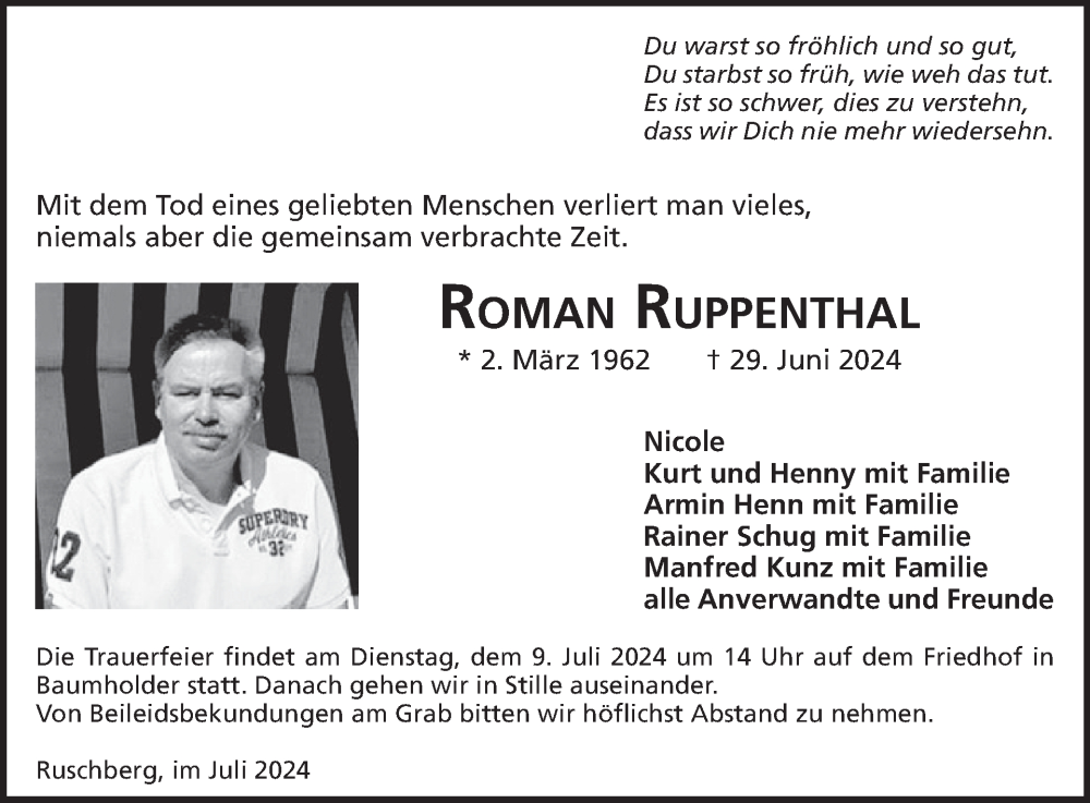 Hier finden Sie alle Traueranzeigen aus der Zeitung, die bisher für Roman Ruppenthal erschienen sind. Weitere Traueranzeigen, die in der Zeitung erscheinen, werden hier ebenfalls aufgelistet