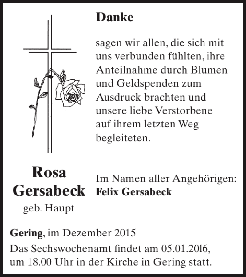 Hier finden Sie alle Traueranzeigen aus der Zeitung, die bisher für Rosa Gersabeck erschienen sind. Weitere Traueranzeigen, die in der Zeitung erscheinen, werden hier ebenfalls aufgelistet