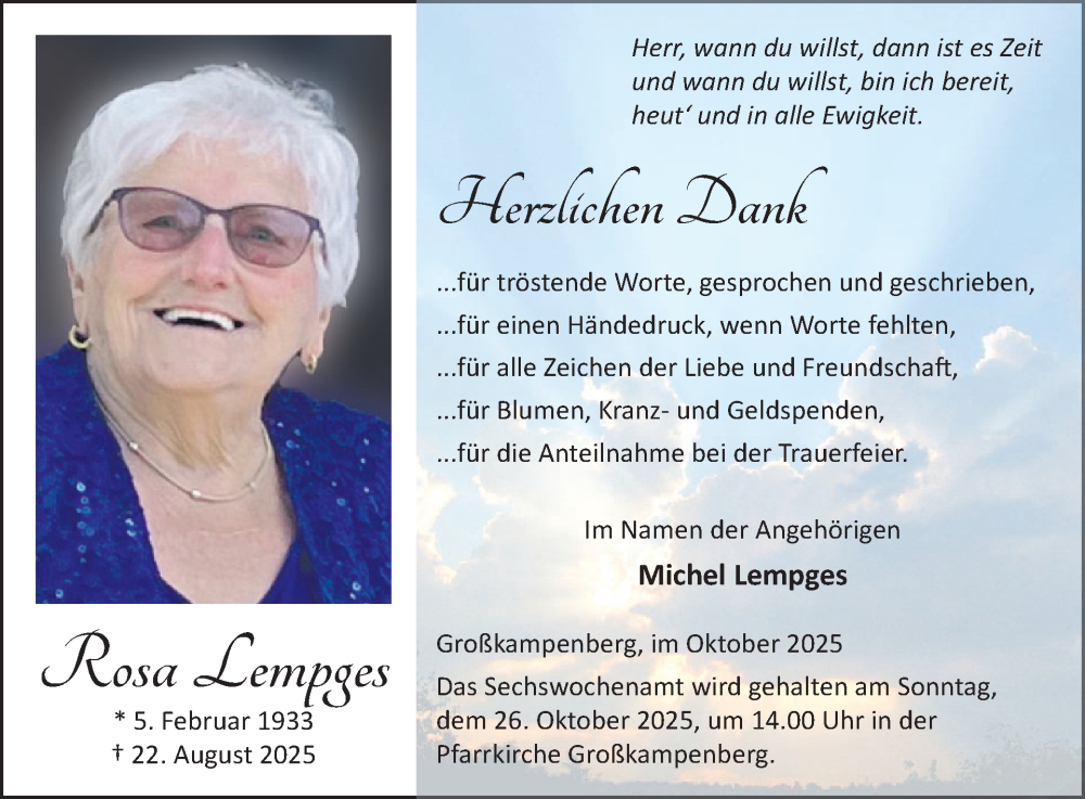 Hier finden Sie alle Traueranzeigen aus der Zeitung, die bisher für Rosa Lempges erschienen sind. Weitere Traueranzeigen, die in der Zeitung erscheinen, werden hier ebenfalls aufgelistet