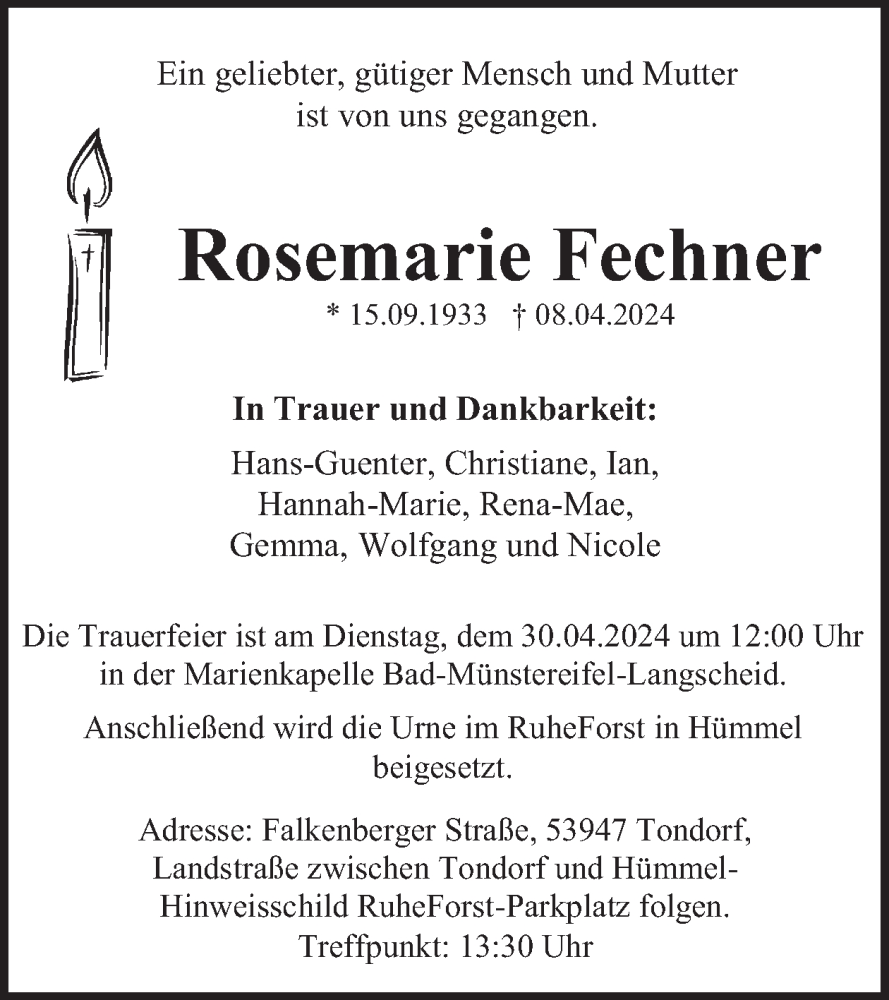 Hier finden Sie alle Traueranzeigen aus der Zeitung, die bisher für Rosemarie Fechner erschienen sind. Weitere Traueranzeigen, die in der Zeitung erscheinen, werden hier ebenfalls aufgelistet