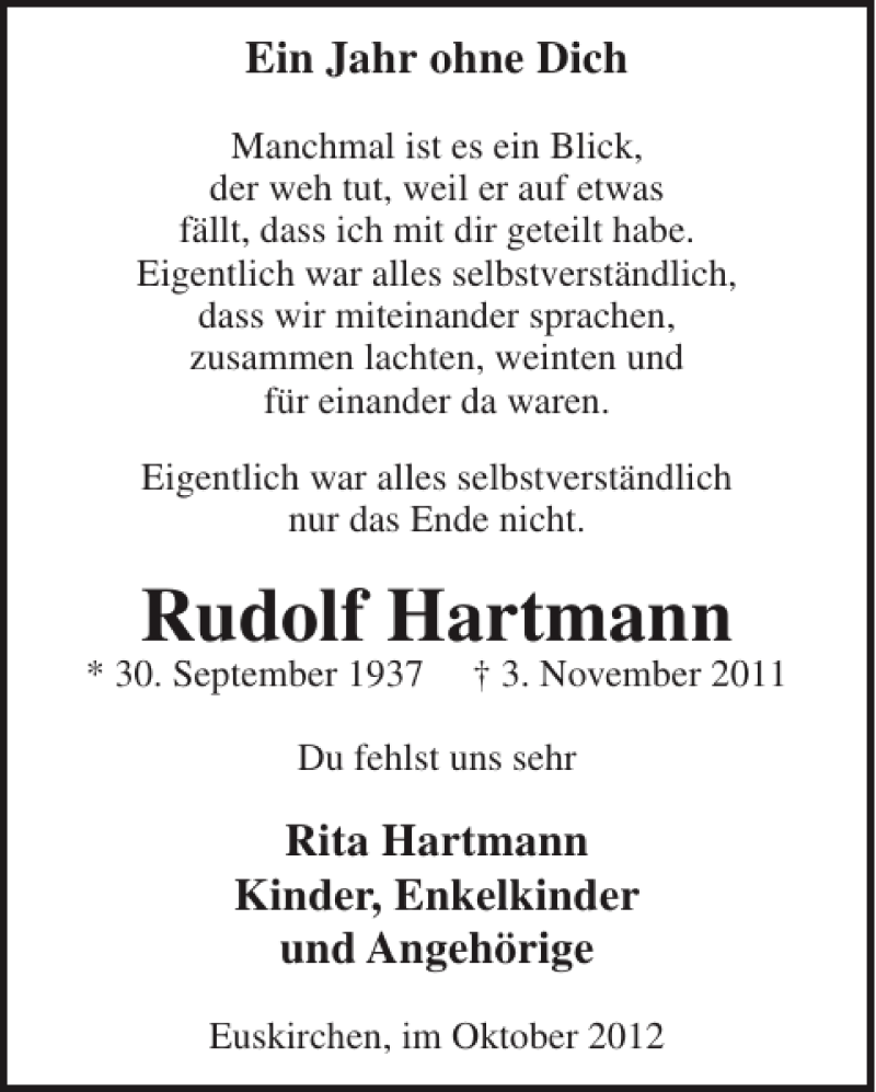 Hier finden Sie alle Traueranzeigen aus der Zeitung, die bisher für Rudolf Hartmann erschienen sind. Weitere Traueranzeigen, die in der Zeitung erscheinen, werden hier ebenfalls aufgelistet