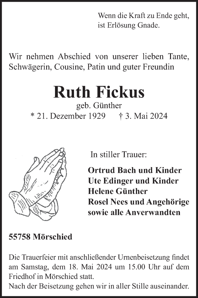 Hier finden Sie alle Traueranzeigen aus der Zeitung, die bisher für Ruth Fickus erschienen sind. Weitere Traueranzeigen, die in der Zeitung erscheinen, werden hier ebenfalls aufgelistet