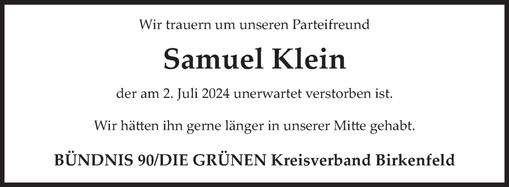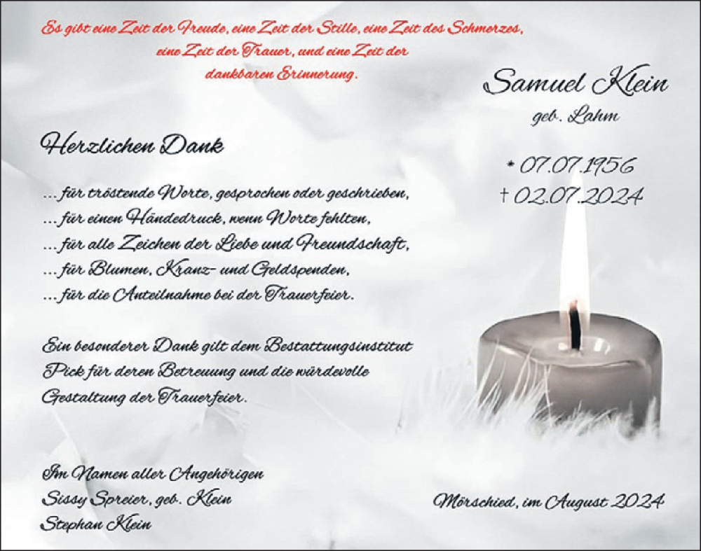 Hier finden Sie alle Traueranzeigen aus der Zeitung, die bisher für Samuel Klein erschienen sind. Weitere Traueranzeigen, die in der Zeitung erscheinen, werden hier ebenfalls aufgelistet