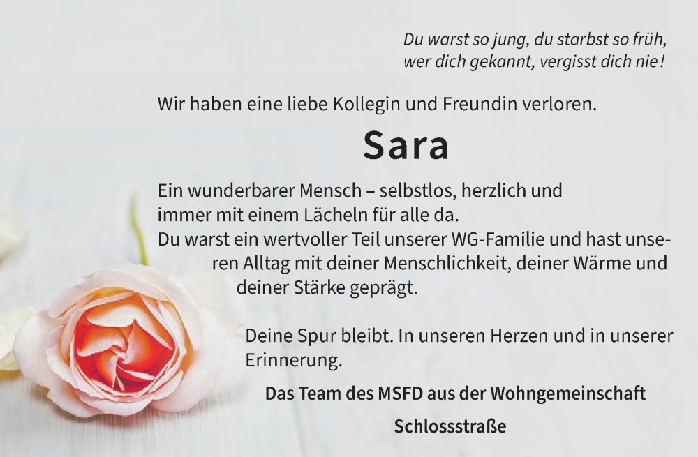 Hier finden Sie alle Traueranzeigen aus der Zeitung, die bisher für Sara erschienen sind. Weitere Traueranzeigen, die in der Zeitung erscheinen, werden hier ebenfalls aufgelistet